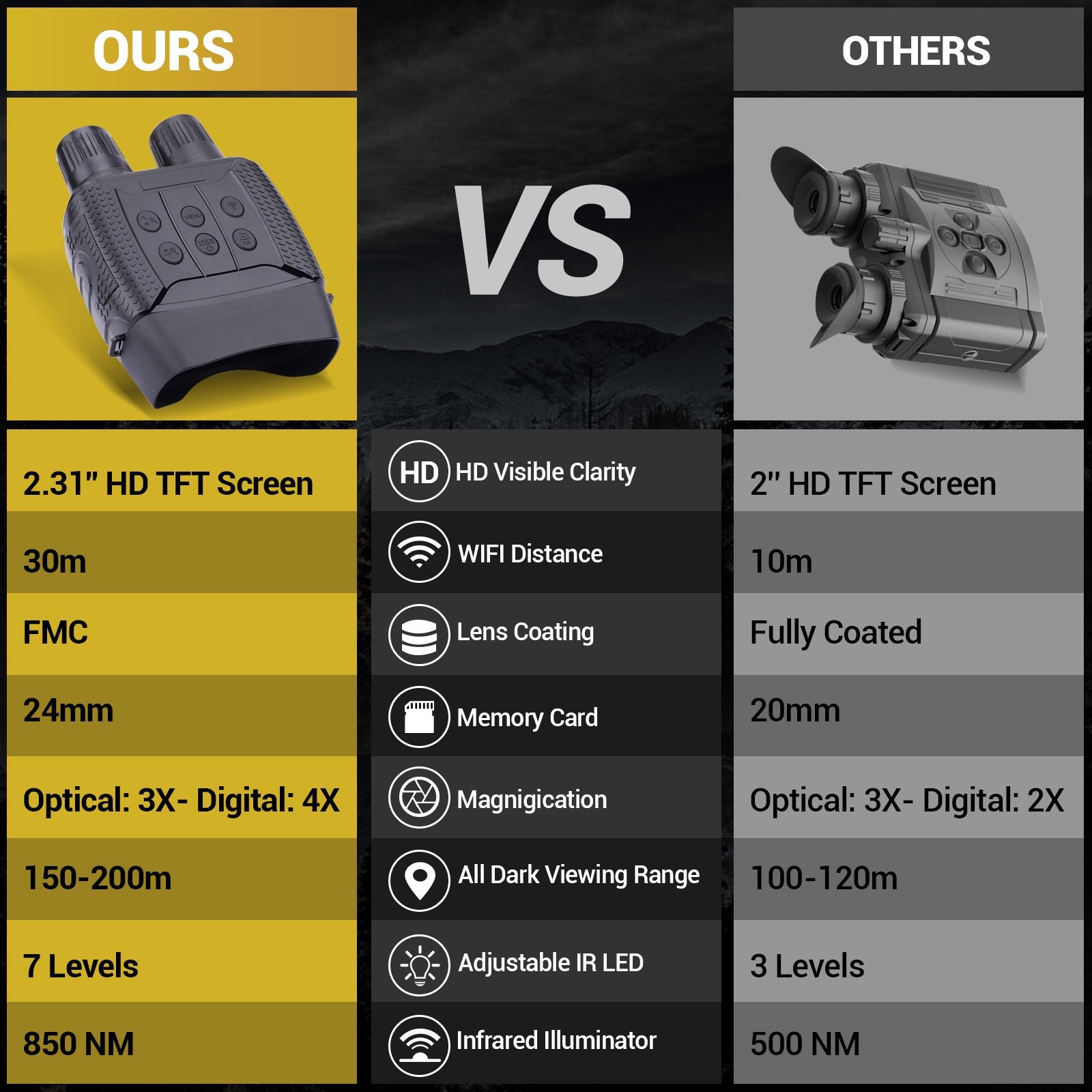 Night Vision Goggles——As an professional night vision binoculars, it features more a full optical system: 4x digital zoom,3x optical magnification, 24mm FMC lens,high sensitivity sensor and Large 2.31'' HD TFT screen.You can see the animals and plants clearly in the 100% darkness or dim ambient light, to capture high definition photos & videos with its outstanding optical clarity in the daytime, low light, or night time.The one more greatest feature of this night googles is Wilf Remote Control, you can donwload the "NV Plus" to acheives some actions like: take and view video or photos/ parameters setting/ delete and download; Perfect binoculars for outdoor activities, night hunting, patrol detection, security and surveilla, search & rescue, camping, watching wildlife and scenery.