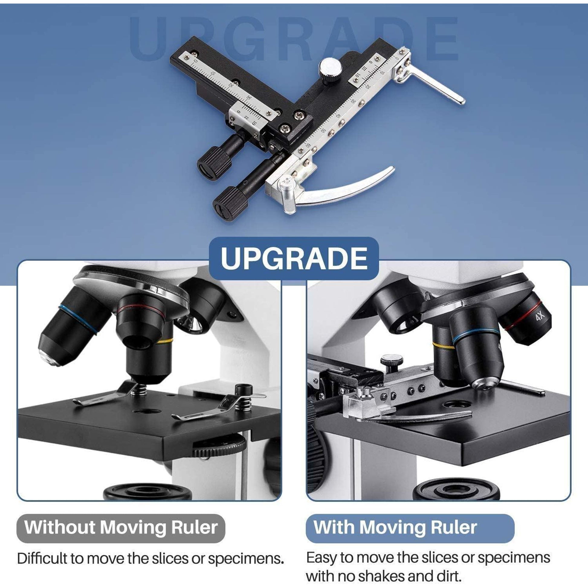 Professional Microscope w/ Moving Ruler:Moving Range 40x60 mm. X-Y Dual-directional Adjustment. Easy to move the slices or specimens with no shakes and dirt.Great Microscopes for adults