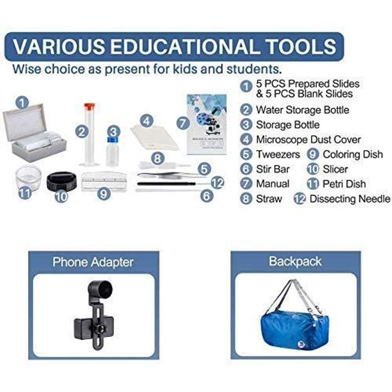 Package:1X Microscope1X Smart Phone Adapter1X Backpack1X Slide set (5pcs blank & 5pcs prepared)1X Tool Set1X Manual