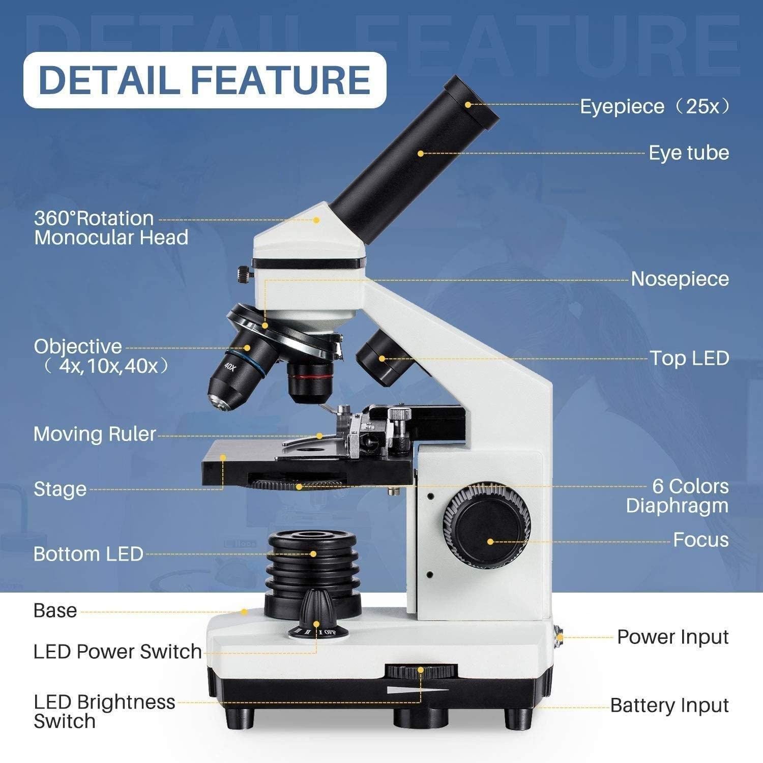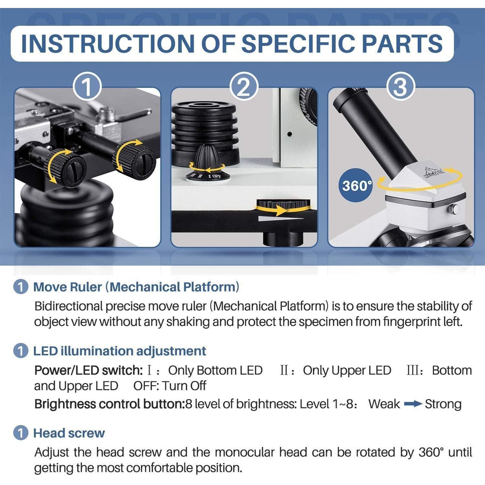 Various Educational Tools : The Biological microscope kit comes with 5 pcs blank slide and 5pcs prepared slides, handbag, multi-language manual, operation accessories, etc. Our microscopes for students includes everything necessary, wise choice as present for kids and students for science learning.