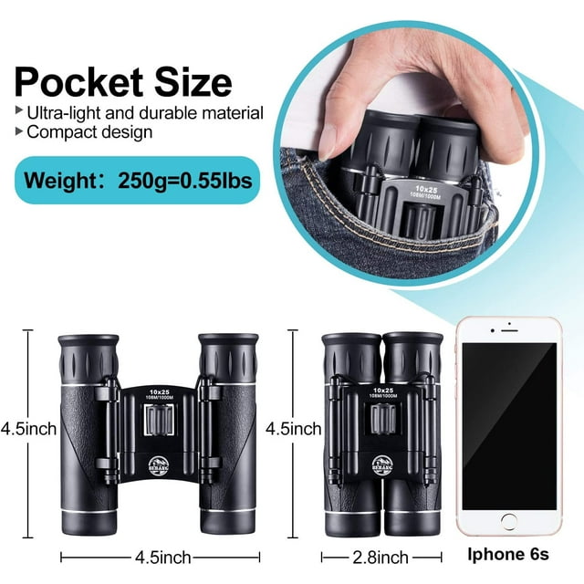 Compact binoculars have an excellent BAK-4 prism, which can 100% reflect the light to keep a ultra-high-definition image. Binoculars with high-end lens coatings provide excellent high-contrast images with excellent color reproduction, so you can see every detail in any situation you encounter during bird watching. The center focus mechanism is used for easy adjustment and fast focus, Folding binoculars are centrally configured with a roller system for precise adjustment, Adjustable eye width makes this optical binoculars suitable for adults and children. Pocket size perfect for carrying anywhere Compact binoculars clear field of view and high resolution images compact, simple design, light weight, can be folded also comes with a neck strap and carry bag, easy to store and carry. Anti-slip design using non-slip natural rubber material, with non-slip pattern on the back, lightweight binoculars more durable and user-friendly, so you can more firmly control it, without worrying about the binoculars will fall down when children use. Pocket size only 0.55lbs, make this MINI binoculars is convenient for you to bring anywhere. Great for bird watching, traveling, sightseeing, sports, concerts etc... Portable binoculars is also kind for you to use it with your children since it's mini size is easy for them to hold. Enjoy the beauty, enjoy parent-child time!