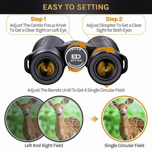 Powerful 10X42 Binoculars Allow You Find More Wonderful World. Fit for different Occasion: watching bird, wildlife,sports,concerts,opera, travelling, hiking, camping,hunting and so on. BaK-4 prisms for bright, clear, crisp viewing; Multi-coated optics for superior light transmission Twist-up eyecups Large center-focus knob for easy adjustments Roof Prism System and Longer eye relief