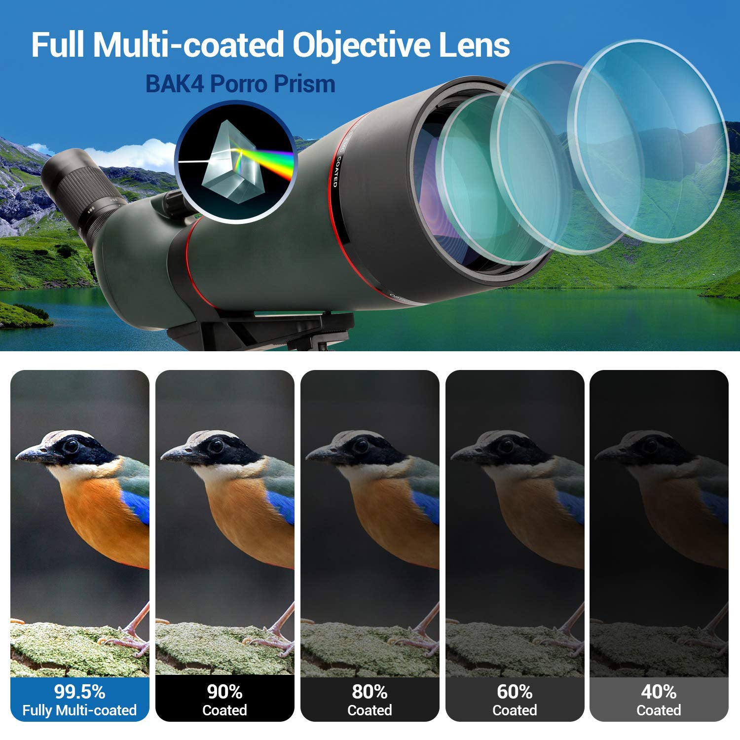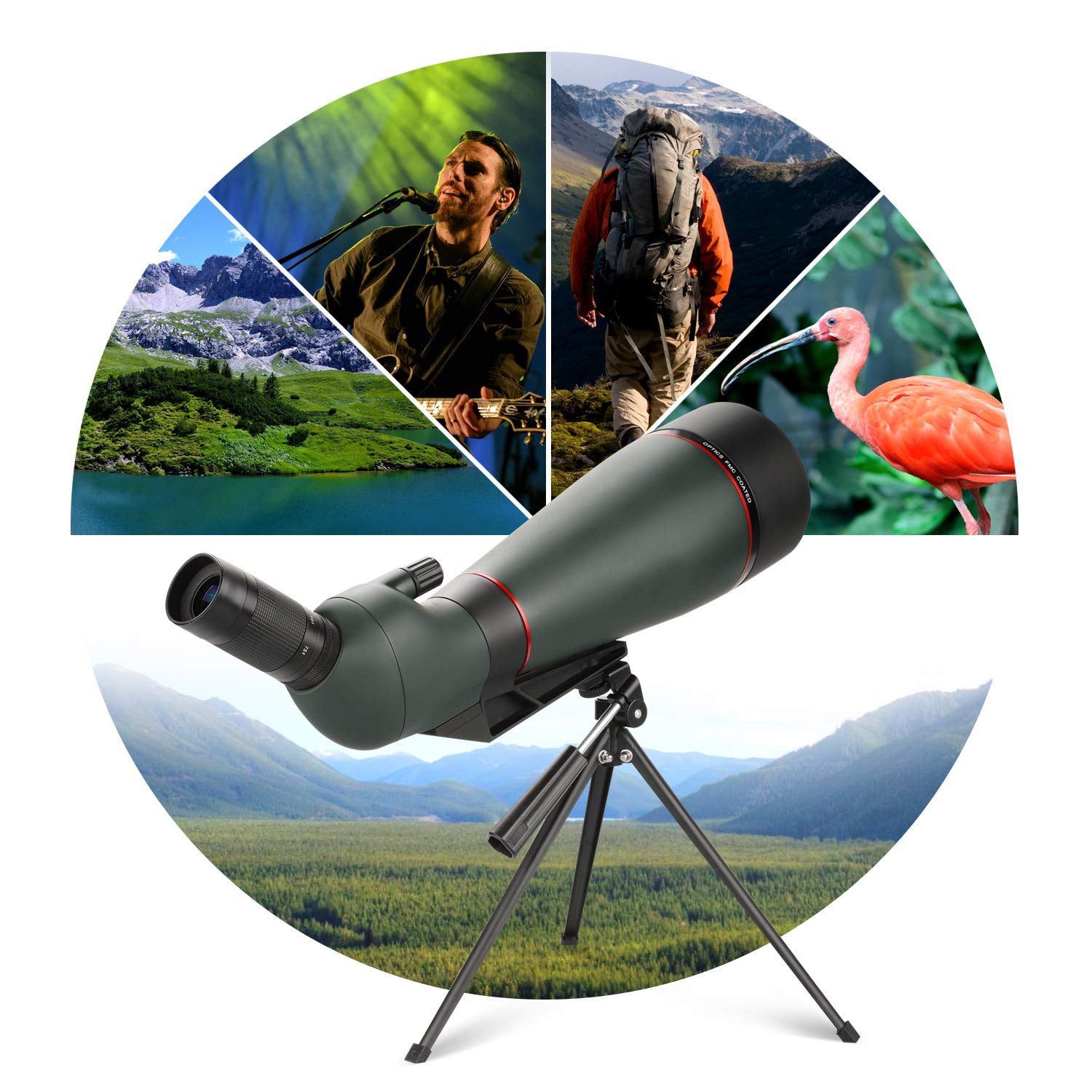 - 【FMC Lens】Spotting scope's objective and eyepiece make by high quality optical lens, which covered with full-multi-coated green film. Effectively increase light transmittance and reduce chromatic aberration, provide brighter, clearer and sharper image and better version experience.The spotting scope can be easily adapted to wetlands, rain forests, or seaside and other humid environments.