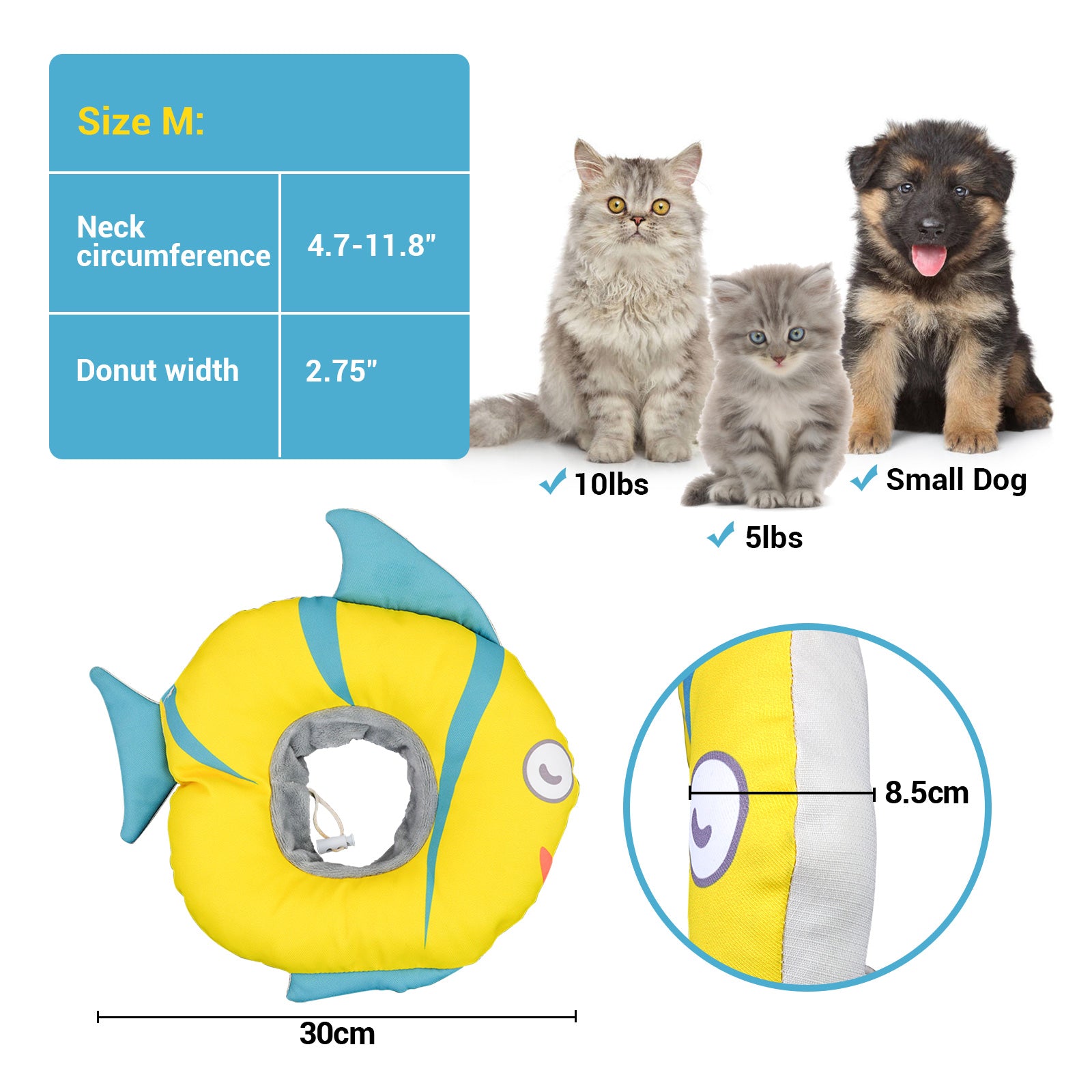 - 【Protect Your Cats and Small Dogs】Recovery collar is a safe and good method of preventing pet from aggravating a healing wound or injury. The cute carton fish collar will not block your kitten's vision, they can eat, drink, sleep and play normally.