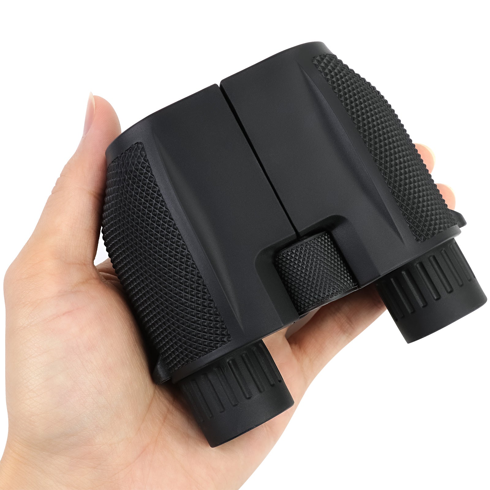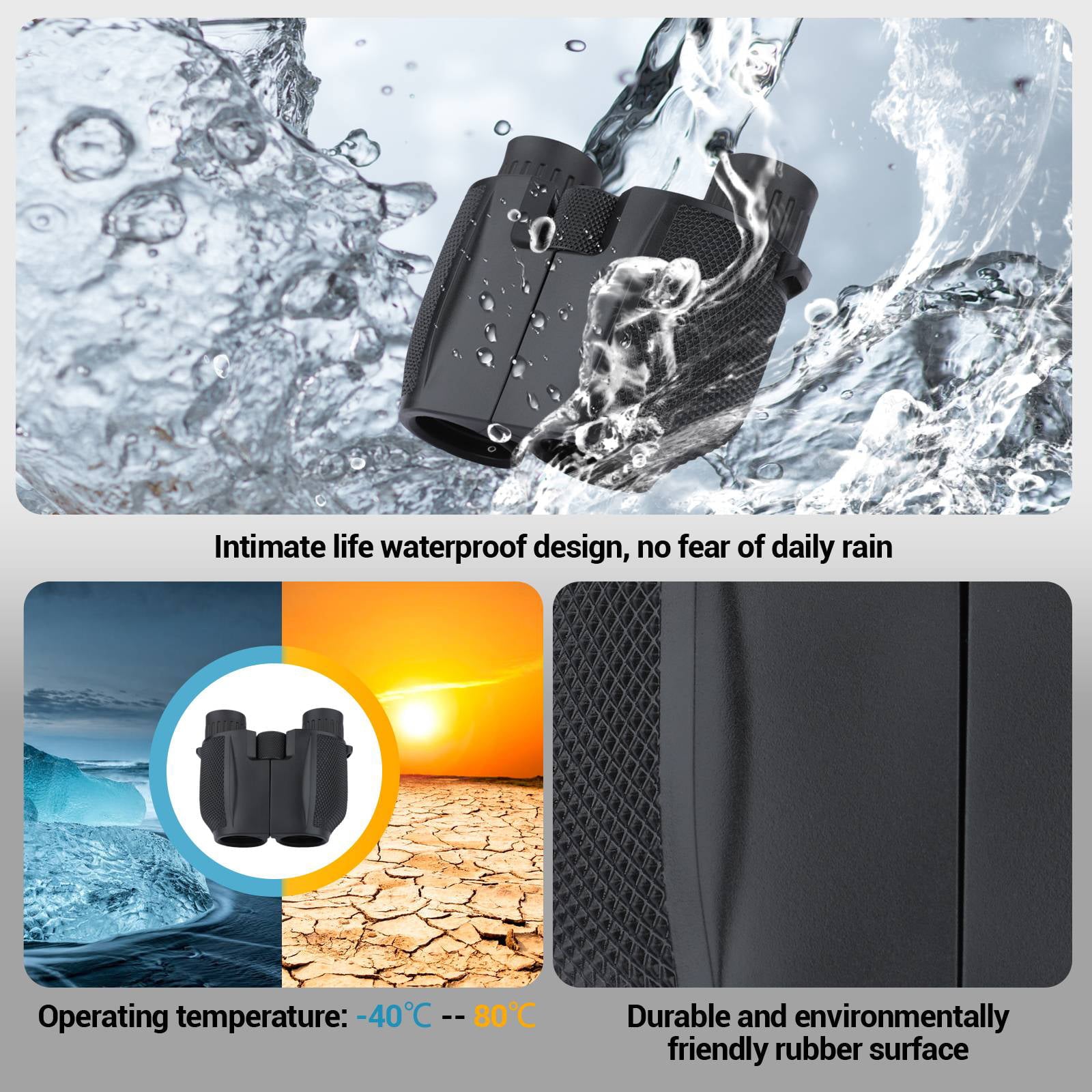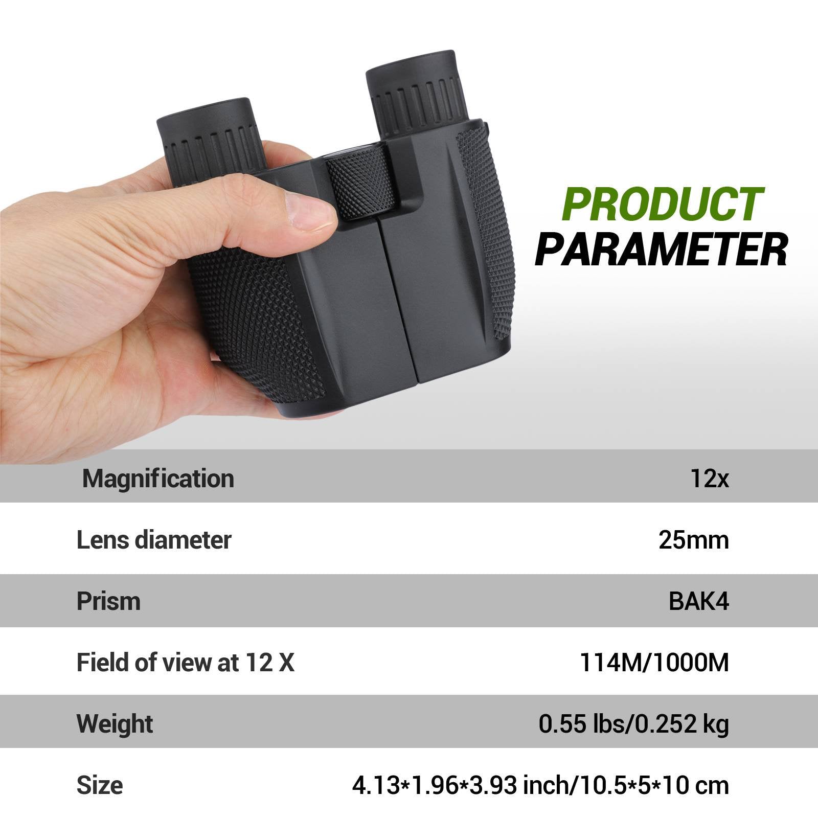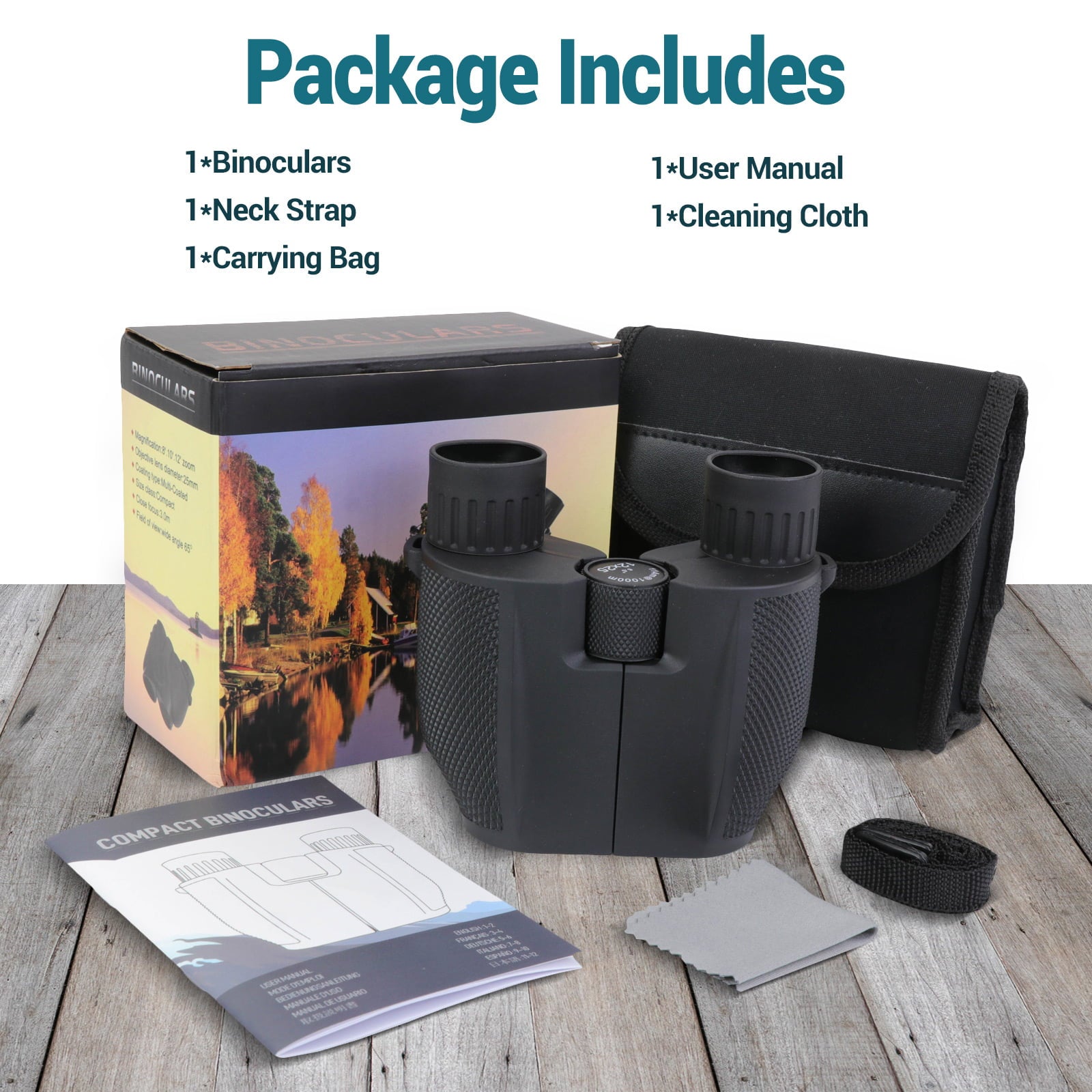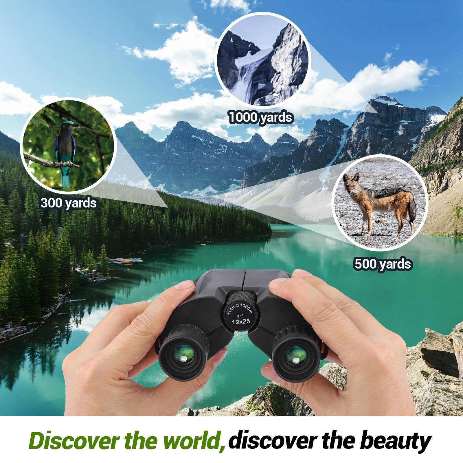 Binoculars-The 10x25 compact binoculars, designed with 02X high power magnification and 25mm object lens,offering you 374ft/1000yds(114m/1000m) field view. The mini binoculars equipped with FMC (fully multi-coated) lens,resulting in higher light transmission for bright, sharp and contrast images, and non-chromatic aberration.With the right eye diopter circle and center focus wheel, you can quickly lock and zoom in the objects, making it easy for adults and kids alike. The pocket binoculars is portable and handy, You can put it in your pocket or hang it around your neck. Its small size and weight are perfect for carrying around when you go out.The mini binoculars very uitable for bird watching, alaskan cruise vocal concert, football game hunting, traveling,adventuring, hiking, camping, concert, theater, game, opera.Perfect for holiday gift choice whether it's for adult ,kids and eyeglass wearers, will be your first choice.